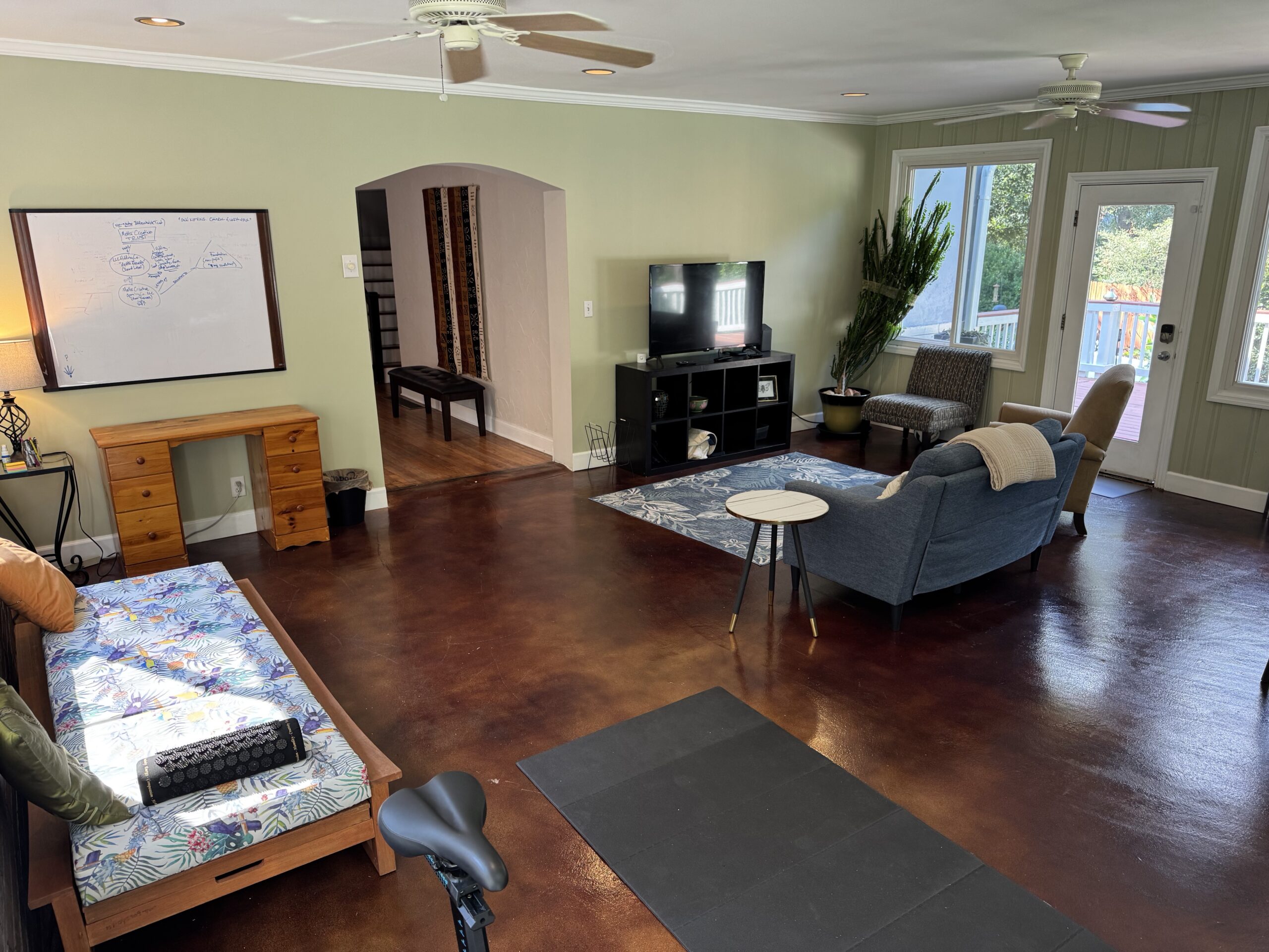 The Reishi Bus @ Resis a cozy 250 sq ft tiny home with a raised roof, full-size bathtub, spray-foamed insulation, and double-pane RV windows to keep things comfy. She’s parked in the backyard of my home near Atlanta’s Westside Park, just minutes from downtown. You’ll share the outdoor space, including a fire pit, pool, volleyball, and basketball courts, with me and other guests. You’ll also have access to the shared main house for full bathrooms, shared kitchen, and living areas.